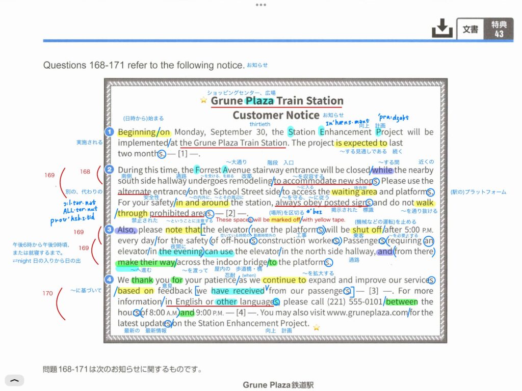 (レッスンノートの一例、TOEIC LR試験 Reading Part7の英文)