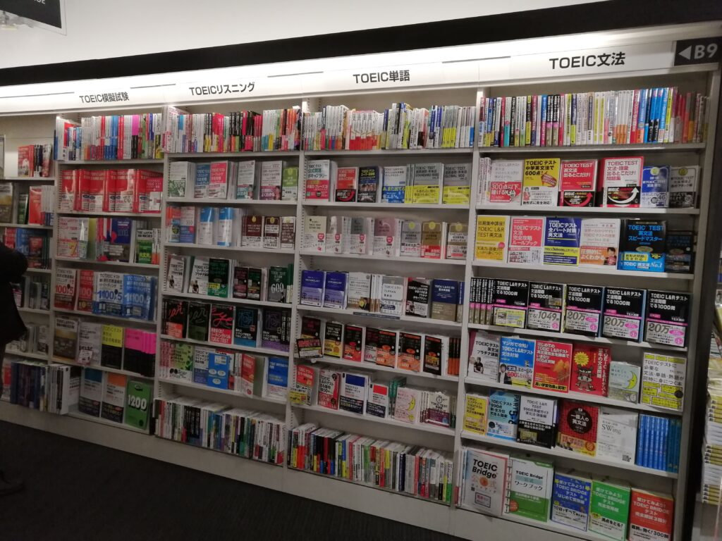 (参考写真: 都内の大型書店。TOEIC LR試験対策本だけでこんなにも。岩手県の一番大きな書店以上の書店が首都圏にはたくさん有る。岩手県の女子高生が求めているのはこの参考書が当たり前のようにたくさんある環境)